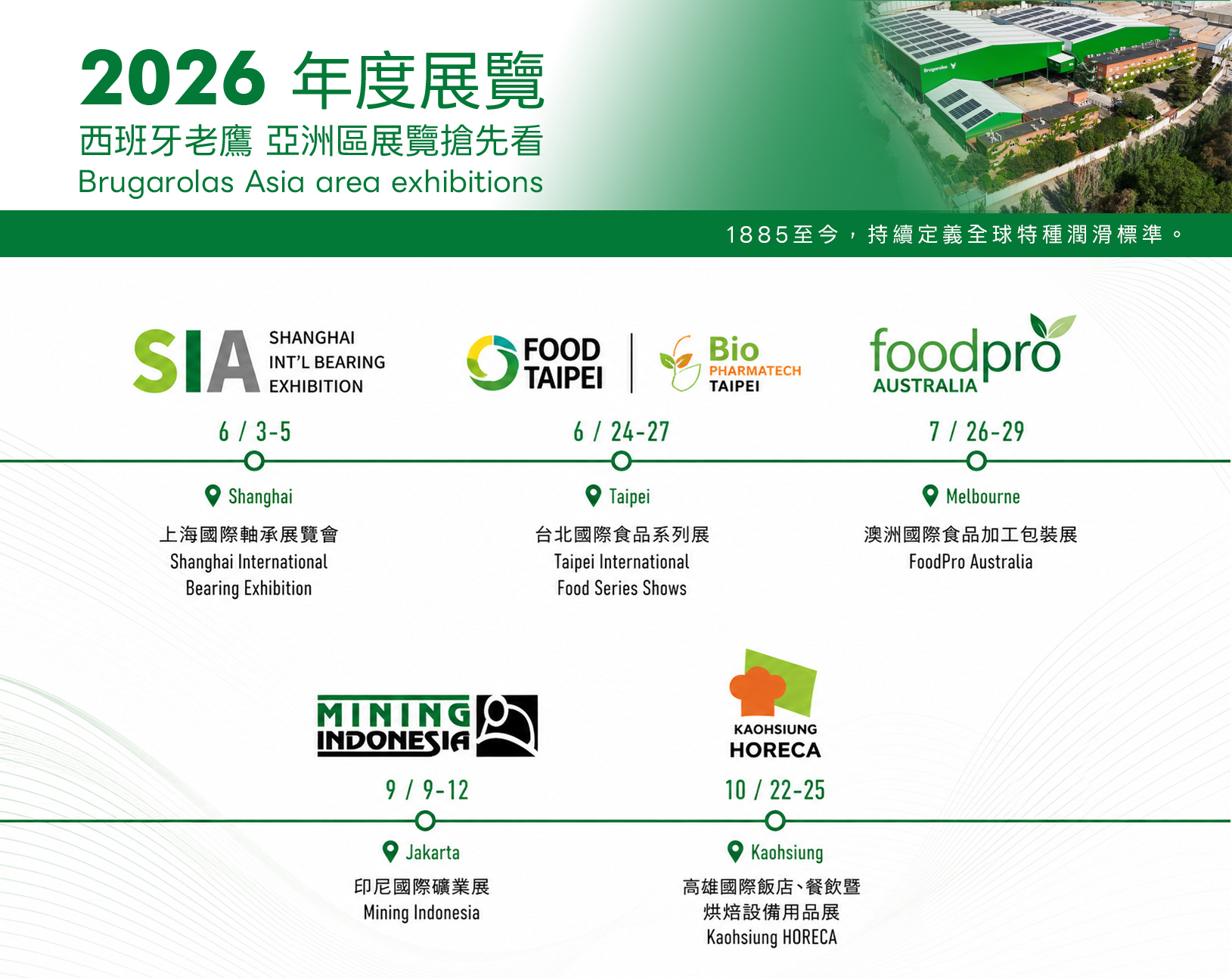 由於礦物油可隨食品加工和供應鏈一起進入食品,現今已在各種食品中發現它的污染。 潛在礦物油的來源為燃料、潤滑油、表面處理劑,配料油,包裝材料等。日前已接獲全球食品行業的龍頭相關消息,要求協力廠商使用不含MOSH/MOAH FREE的食品級潤滑油。因應將到來的食品行業新浪潮,西班牙老鷹Brugarolas系列MOSH/MOAH FREE的食品級潤滑油正式下線,提供領先行業的食品加工商採購。
