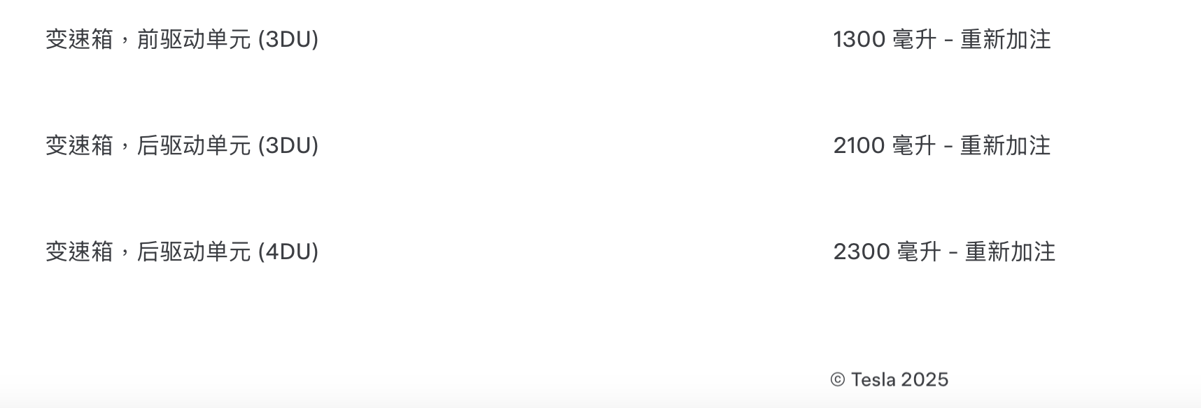 規格:Dexron VI ATF 或 符合Tesla 原廠規範的合成油。